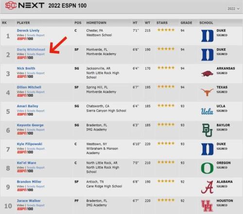 达里克-怀特黑德身高2米01,臂展2米08,锋卫摇摆人。怀特黑德高中就读于篮球名校蒙特沃德学院,选秀网站Rivals将他排在全美第一,ESPN把他排在全美第二,247sports则将其排在全美第三。总之,怀特黑德就是2022届顶级高中生。