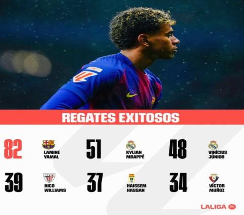 西甲官方晒本赛季成功过人榜:亚马尔高居榜首,姆巴佩次席