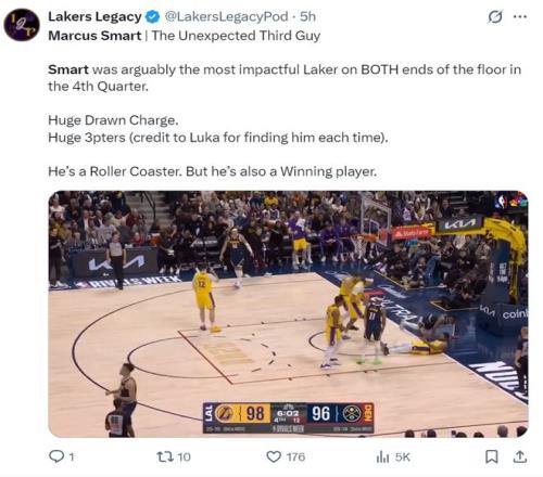 这场比赛的斯玛特绝对算得上湖人的超级奇兵,终场前6分02秒斯玛特制造沃特森进攻犯规,随后斯玛特进入Zone的状态,5分44秒制造沃特森三分犯规三罚全中,5分10秒接东契奇助攻三分命中,2分43秒三分球再度命中,在这短短的179秒里斯玛特连拿9分,湖人直接将分差拉开到12分。